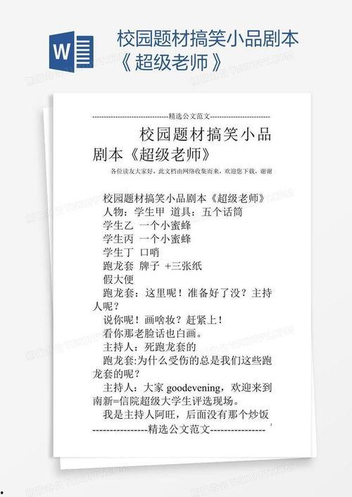 学生时代,总是充满了欢声笑语。校园里的小品剧本,更是将这种欢乐发挥到了极致。比如,有一部名为《课堂奇遇》的小品,讲述了一位老师误将学生的作业当作自己的论文提交,结果闹出了笑话。剧本中,老师紧张兮兮地准备答辩,学生则在一旁偷笑,场面十分搞笑。